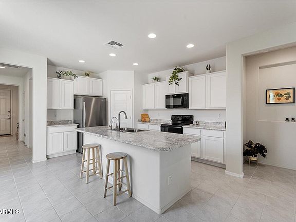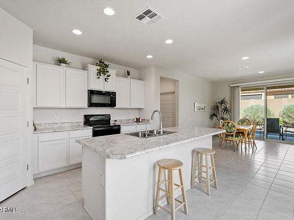 Amazing Pulte home in the prestigious Sun City Anthem at Merrill Ranch! This abode showcases an excellent curb appeal with a desert landscape and an oversized 2 car garage. The interior boasts a lovely foyer, an office/den, a formal living room, and a spacious great room. Tall ceilings, soft paint, tile flooring, upgraded lighting and soft carpet are throughout the house. The white kitchen features staggered shaker cabinets, ample counters, built-in appliances, and a walk-in pantry, large island with breakfast bar with a view of the sunny courtyard. This perfectly flowing layout with multiple sliding glass doors allows easy entertaining. The primary bedroom hosts an immaculate ensuite with two sinks, a vanity desk, and a spacious walk-in closet.