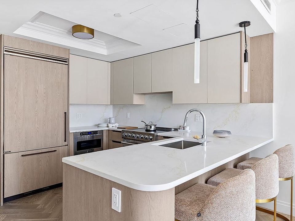 White Oak herringbone wood floors flow throughout the primary living spaces, while oversized, triple-glazed windows fill the home with radiant natural light. A seamless connection to the outdoors is offered by the adjacent private 125-square-foot terrace, an intimate extension of the living space ideal for morning coffee or evening gatherings.