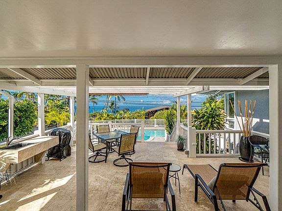 Designed for indoor/outdoor living, This open & Airy Bungalow-Beachhouse is located across the street from the Kona shoreline and steps away from Kahaluu Beach Park. Featuring a Chef's kitchen, spacious, covered and open lanai for dining and sunbathing, and a large enclosed above ground pool for a nice cool down. Kitchen boasts Travertine flooring, vaulted ceilings, Koa cabinetry, and Van Gogh granite tops with Teal & Aqua blue coloring and orange, burgundy, and white veining. Master bedroom has its own walk in shower and is accessed from the living area. The second bedroom has its own bath, separate driveway, one car enclosed garage, and separate entrance for privacy. It can also be accessed from the upper lanai. Plenty of room behind house in covered area to add extensions to house or accommodate a boat. Approximately 2 miles South of White Sands Beach, the largest beach in Kona.<br>The house is a popular short term vacation rental having had several upgrade over the past few years.