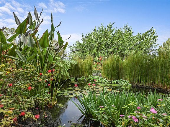 Lush tropical groundsCovered lanaiTranquil water featureSerene tropical pondBreathtaking coastline viewsVibrant landscapingPrivate patio