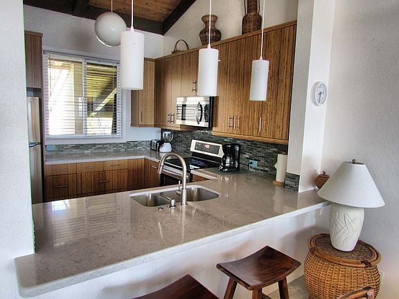 Top floor, end unit and oceanfront. Welcome to the best of Keauhou Surf and Racquet. This hard to find, fully updated, turn-key condo embraces the oceanfront Hawaii lifestyle. Open the upgraded sliding doors and greet the blue Pacific. Let the tropical breezes and natural light flow through the numerous windows. The enlarged kitchen opening expands oceanfront and showcases bamboo cabinets, stainless appliances and quartz counter tops. Vaulted ceilings and wrap-around windows make this unit live large, light and bright. The lanai wraps around and offers top-floor privacy. Watch whales, dolphins, boats and sunsets without leaving the lanai. This has been a very lightly used vacation rental and additionally features an on-demand water heater and new washer and dryer. Keauhou Surf and Racquet offers a swimming pool, three tennis courts, a volleyball court, and a barbecue area. This ideal location is close to the Kahalu'u and Magic Sands beaches and Kona Country Club golf course.