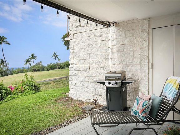 Ocean view and golf course frontage living in this lovely 2 bedroom 2 bathroom ground floor condo. Bright, breezy, and move in ready. Impeccable setting along Alii Drive, adjacent to the Kona Country Club Golf Course in spectacular Keauhou. Enjoy ocean views from the main living area, both bedrooms, and the lanai. Full wall of windows/sliding doors to large tiled lanai, with lanai adjacent to lawn area extending to tropical gardens and swaying palm trees providing expansive scenic views and tranquility. End unit offers extra privacy and light with windows in every room. Primary bedroom suite is privately tucked from living and kitchen area. Second bedroom or office option with large closet and sliding privacy doors. Unique open concept larger living area with sliding doors and cabinet bed stowed. Two full baths. Fresh paint throughout, new laminate flooring throughout, newer stainless kitchen appliances and brand new dishwasher. Quartz countertops. Ample kitchen pantry and cabinet storage. <br>Community grounds with ocean view pool and lounge area, and tree lined tropical gardens. One parking space is included, and abundant visitor parking available. Monthly Association Dues cover water, sewer, internet, basic cable TV, grounds and landscaping maintenance, and rubbish removal. Resort zone where short term vacation rentals are allowed. One small pet allowed with association approval. Unit is ideally located within the complex for lovely views and separation from the access road and parking lot. Also ideally located for multiple recreation opportunities and just minutes to ocean access for swimming & paddling, weekly farmers and artisan markets, the Keauhou Shopping Center for groceries, dining, and entertainment. Just a few steps from your door to miles of walking and bicycling lanes along Alii Drive, as well as the entrance to the Kona Country Club golf course that is open to the public. Your ultimate Hawaii living awaits!