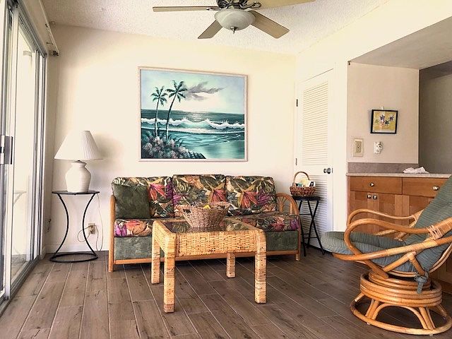 Furnishing lets you have the Hawaii experience as soon as enter. You immediately feel at home in this great condo. Enjoy entertaining on the large lanai as you watch the beautiful sunset maybe with a cocktail. The family and friends will really enjoy visiting while watching golf carts go by. .This condo has been a very good long term rental but and has been kept up well. Also can be a short term rental with no restrictions for the amount of days. Turnkey upstairs unit with some golf course view. Open floor plan with Tile floors for easy cleaning and new flooring in kitchen and 2 bathrooms. Can sleep 6 because of the 2 hide-a-beds. .Main bedroom has a large mirror closet. King size bed with plenty of drawers in the dresser also 2 nightstands and lamps. Main bathroom has a tub/shower combo and toilet in one room and sink in other. 2nd bedroom can be private after you close the sliding folding door. Hall bathroom is really nice with a nice size shower. A very bright kitchen has everything most people need to cook with. Washer and Dryer inside condo. Lanai has 2 chairs and table for 4 which over looks the large grass area. The complex has a pool and exercise room. Shopping center is just a few blocks away with good restaurants, a medical center and nice stocked grocery store. Keauhou Bay is a short distance by walking or driving. Fairwind adventures has snorkel and manta ray trips from the bay. Also at the bay is a park with plenty of shade so you can have picnics and swim. DOM isn't accurate because it was in Escow. Then upgrades were done. Some are the ceiling fans, flooring and closet doors.