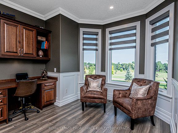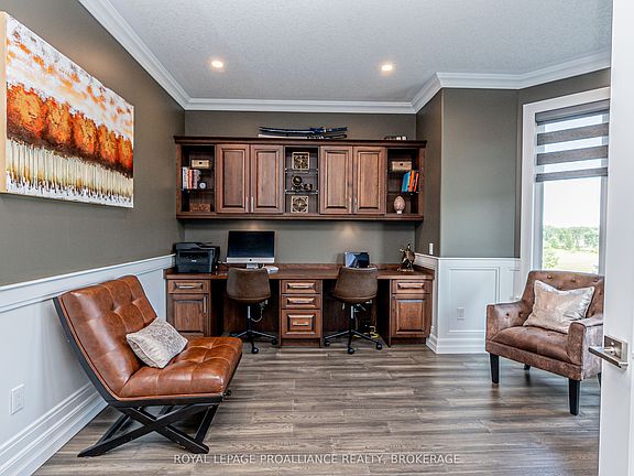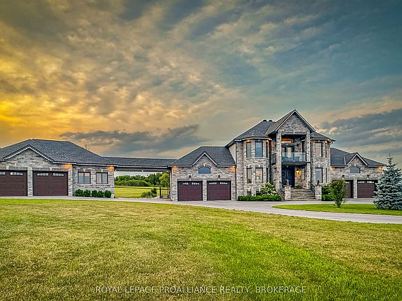 Welcome to your dream retreat in Glenburnie-an exquisite custom home by Legacy Fine Homes, nestled on 7 rolling acres of lush countryside. Through electronic gates and up the private asphalt drive, this majestic property reveals itself with two attached 2-car garages and a detached 2-car garage featuring a built-in office. Inside, luxury meets thoughtful design. The main floor offers a sun-filled living room with fireplace and walk-out to the sunroom, an elegant dining room, and a gourmet kitchen with quartz countertops, waterfall breakfast bar (seats 6), high-end appliances, and walk-out to an enclosed BBQ area. A main floor bedroom, stylish 3-piece bath, office, and mudroom complete the level. Upstairs, the primary suite impresses with two walk-in closets and a spa-inspired 5-piece ensuite. Two additional bedrooms share a semi-ensuite 3-piece bath with dual vanities, and the laundry room adds convenience and charm. The lower level features a spacious family room, gym with walk-out to the garage, a 4-piece bath, and a fifth bedroom-ideal for guests or extended family. Step outside to an entertainer's paradise: inground pool, hot tub, fire pit, stone patio, and pergolas-all surrounded by serene fields and quiet country air. Just 6 minutes to Hwy 401 and 15 minutes to downtown Kingston's shops, dining, and entertainment.