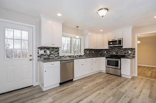 You will not be disappointed with this newly renovated ( like new) split entry home nestled on a 1.5+ acre lot. Exterior updates include new front door, siding, windows, composite decking, gutters, garage doors and landscaping. The modern kitchen offers sought after white cabinets, granite counters, stainless appliances, tile back splash and new wood grain laminate flooring. The massive Stone fireplace boasts character into the grand family room and foyer. New laminate and carpeting thru out. Freshly painted walls, updated electrical and plumbing, new lighting fixtures and new heating system. All bathrooms have new fixtures, vanities and flooring. The basement offers two additional rooms for entertaining or relaxing, a 3/4 bath and laundry area. Oversized garage with ample space for a work area. Just minutes to Rte 122, Rte 56 and Rte 31. This is a must see.