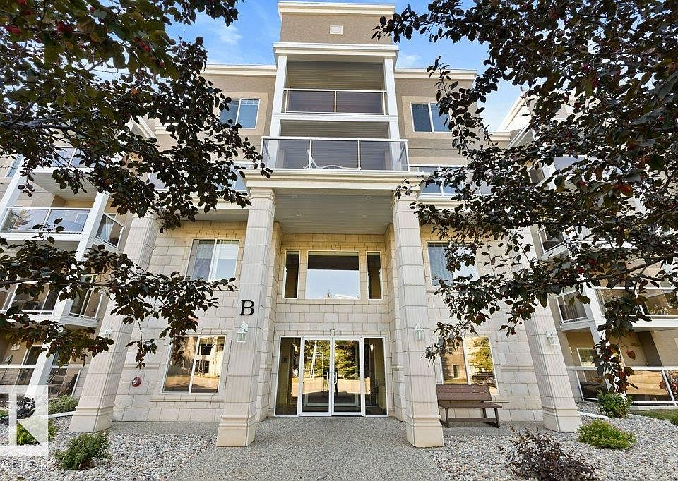 Welcome to Mission Hill Grande, ideally located in the heart of St. Albert! This sought-after complex offers fantastic amenities including a social/games room, library, and fitness facilities. This bright 2-bedroom, 2-bathroom condo features an open-concept layout with a kitchen offering ample cabinetry and an island with seating. The spacious living room boasts a cozy corner gas fireplace and access to a covered balcony. The primary suite includes his-and-hers pass-through closets leading to a 3-piece ensuite with a walk-in shower. The second bedroom is ideally situated on the opposite side of the unit, next to a 4-piece bath. Added conveniences include in-suite laundry with storage, central A/C, and a titled heated underground parking stall with storage cage. Recent updates include new windows and patio doors. All this, just steps from parks, trails, shopping, schools, transit, and every amenity!