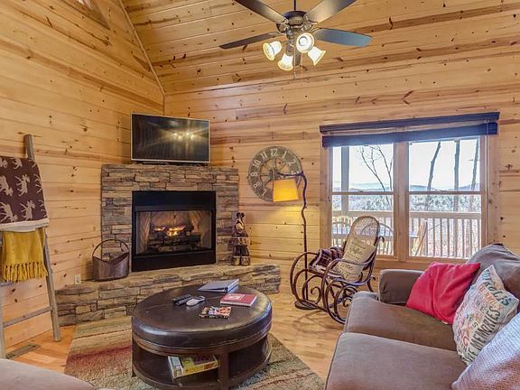 Admire magnificent mountain views from sunrise to sunset at this secluded cabin in Blue Ridge. On 1.53 acres, at the end of a quiet private drive, is this inviting hand hewn log sided 3BR/3BA Cabin with scenic year round Mtn Views. Located less than 15 minutes from Blue Ridge & being sold fully furnished. The cabin is turnkey, ready for a weekend getaway or vacation rental. The interior of the cabin offers lovely furnishings throughout. The main level includes a fully stocked kitchen w/appliances, custom cabinets & breakfast bar, a dining area that seats 8+ & a large comfortable great room w/ gas log fireplace. The upper level master suite begins w/a nice sized loft, spacious Master BR/BA plus private balcony to catch mountain views beside. The terrace level includes an oversized family room, large BR & 3rd Bath plus several storage areas. Exterior includes 2 covered porches facing the wide long range MTN views, pool table, rocking chairs, a grill, hot tub & fire pit area for your vacation pleasure.