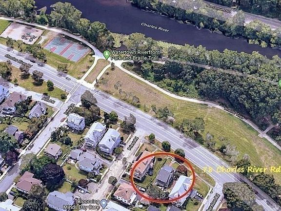 Highly sought on Charles River Rd, set on Watertown's Riverfront Park w/magnificent views, this 3-story, 1931 Craftsman-style w/4 beds and 2 baths is filled w/historic charm, natural woodwork, and hand-crafted elements. At the center, a foyer w/dramatic columns that flank the entrance to the LR and DR, a wide ½ landing staircase to the 2nd fl, an archway to the kitchen and a step down to the 4 season porch. LR w/frplc and bay window opens to a formal DR w/a 10'x2' built-in bench overlooking the yard. Custom Kraftmaid KIT w/L-shaped peninsula accented by granite, stone, wood beam ceiling, recessed lights, packed w/nooks, pull-outs w/built-in desk! Handy 1st flr bath w/laundry! 2nd fl w/3 gracious beds, an office and a full bath. Walk-up finished attic, 9' ceilings, massive w/panoramic views of the Charles! W/O fin LL w/fresh paint, plank flrs. Gas heat/cooking, large closets and hdwd thruout. Oversized 1 car gar! Parking! Prof landscaped, brick patio offers quiet retreat! Commuter Dream