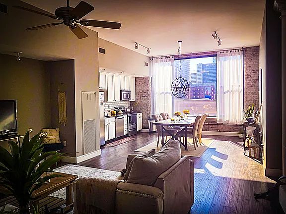 -Open-layout living with character exposed brick walls, soaring ceilings, and ample natural light.