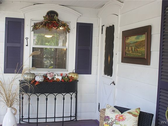 Now is the perfect time to FALL in love with this one-of-a-kind iconic home nestled in the heart of the Village of Williamsville. Just ten houses from Main Street, you’ll be steps away from all the charm, shops, and amenities the village has to offer. This home radiates warmth and character, starting with its inviting covered front porch—ideal for morning coffee or evening relaxation. Inside, you’ll find hardwood floors, elegant wainscoting, and beautifully finished surfaces throughout. The front living room flows seamlessly into the dining area, creating a spacious setting perfect for entertaining. A full first-floor bath features a walk-in shower for added convenience. The eat-in kitchen offers generous storage, includes all appliances, and features a delightful Dutch door that opens to the covered back porch—adding a touch of storybook charm. Basement access is conveniently located off the kitchen. Upstairs, you’ll find a full bath with vintage flair and a hallway lined with recessed closets and built-in dressers offering deep drawer storage. Two comfortable bedrooms await, with the master showcasing exceptional built-ins that enhance the home’s classic village appeal. The detached 38x18 outbuilding serves as a garage with endless possibilities. It includes a full loft, abundant storage, and a covered patio area overlooking the large backyard—perfect for gatherings or quiet afternoons.