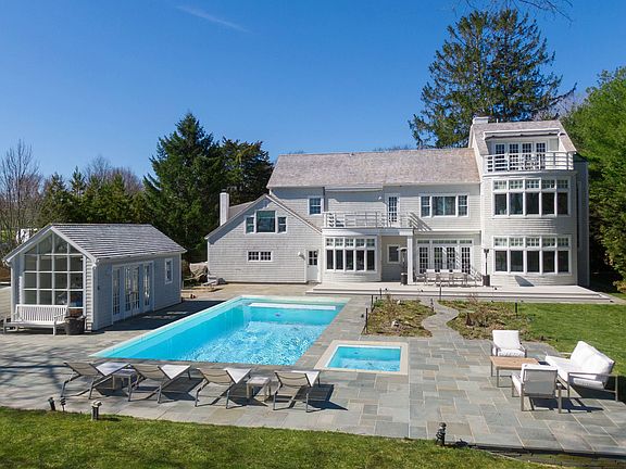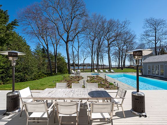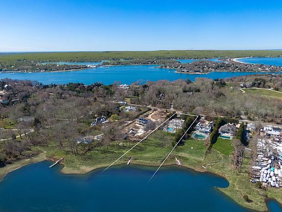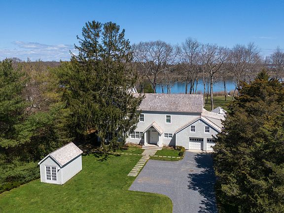 Iconic shingled post modern is situated on this beautiful large 1.5 acres with over 123 ft water frontage on Great Pond Creek which leads out to the upper harbor of Sag Harbor. This perfectly maintained 5 bedroom home with expansive water views has multiple living and entertaining areas both inside and outside. The first floor features an open floor plan with all the main rooms having large windows and French doors. There is the living room with fireplace, formal dining area, chef's kitchen with informal dining area, 2- car attached garage and large laundry room. The second floor includes a master suite with private deck, marble bathroom and large walk-in closet, 3 guest bedrooms, 2 bathrooms and a sitting room facing the waterfront or the 5th bedroom. The 3rd level hosts a home office with its own deck. The lower level includes a game area and screening room. Outside are several decks and stone patios surrounding the large heated gunite pool and spa. There is a charming pool house with outdoor shower. The expansive property includes rolling lawns, gardens, specimen plantings and trees. There is also a dock. All with spectacular views of the tranquil waterfront. 78 Ferry provides the best wf value/opportunity available today in coveted Sag Harbor. Poised between substantial wf estates on either side of this premier location with it's close proximity to Sag Harbor Village. This unique offering is not to be missed.