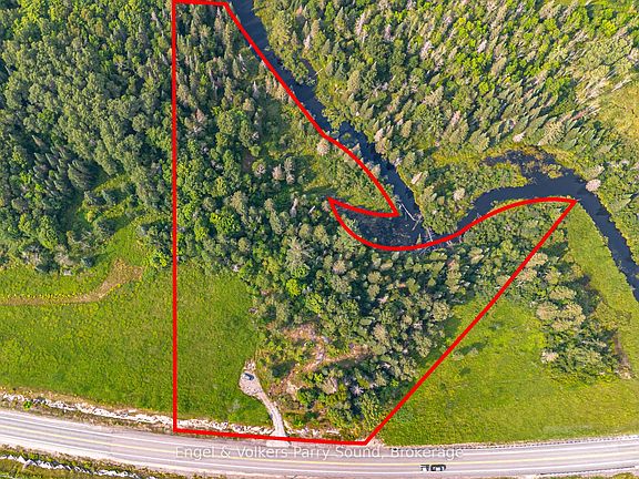 Shadow River Riverfront Estate Lot | 4.55 Acres with 700' of Shoreline. Discover an extraordinary opportunity to craft your own Northern retreat on the tranquil shores of the Shadow River. This rare 4.55-acre estate lot offers an impressive 700 feet of private water frontage, set amidst a serene landscape of open meadow and scattered young hardwoods. Elevated well above the floodplain, the expansive 1.24-acre building envelope provides the ideal canvas for a grand main residence, extensive outdoor living spaces, and private amenities. Gently rolling and beautifully drained, the land invites elegant driveway approaches, manicured gardens, and sweeping river views. Enjoy peaceful paddles along the Shadow River or explore the nearby waters of Lake Rosseau, just minutes away. An MTO-approved driveway from Highway 141 ensures effortless year-round access, with the charming village of Rosseau only 5 minutes away, the Parry Sound Municipal Airport 20 minutes and Highway 400 just beyond. Unmatched in privacy, scale, and location, this is an opportunity perfect for those who dream of designing a riverfront estate that will be cherished for generations.
