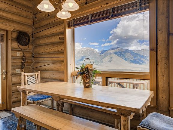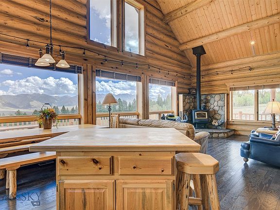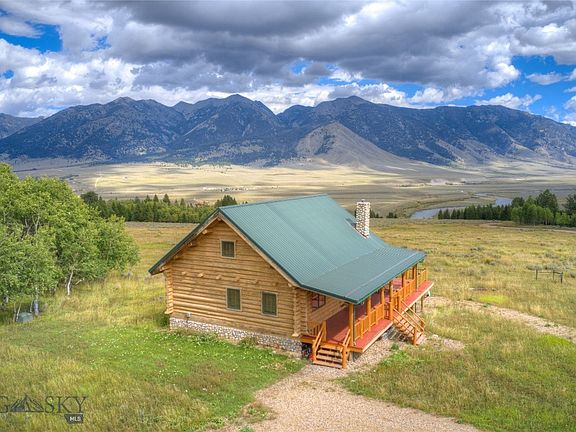 Enjoy Spectacular Mountain and Madison River Views from this beautiful Ron Rohrs handcrafted log home situated on 20 acres in an amazing private setting.  Spacious entryway welcomes you, hardwood floors stretch across the living spaces, exuding a warm and inviting ambiance.  This 3-bedroom, 2 bath home features an open floor plan, vaulted ceilings, game room, river rock fireplace, large windows to enjoy the mountain and property views, dining area that opens onto the wrap around deck perfect for entertaining and BBQ's.