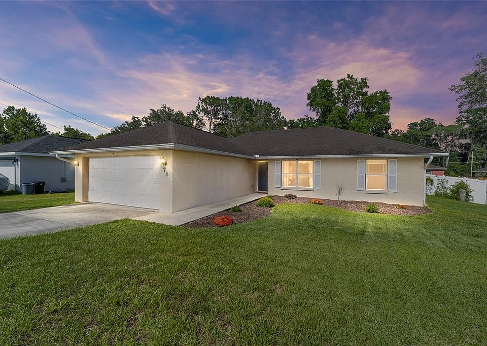 Back on market due to buyer backing out. Their loss is your gain! Spacious 3 bedroom, 2 bath home located in Silver Spring Shores! Large backyard and covered patio! Split floorplan. Tile entryway leads to the great room. Living room has high ceilings and easy access to the kitchen featuring an island, granite counters, tile backsplash, stainless steel appliances, upper and under cabinet lighting, and pantry. The dining area is at the front of the home with a large picture window overlooking the lush front yard. The 2nd and 3rd bedrooms are located on the right side of the home with carpet, ceiling fans, and blinds. The 2nd bath has a large single vanity sink, and shower/tub. Across the house is the master bedroom with carpet, huge walk-in closet, blinds and ceiling fan. The master bath has a walk-in shower, medicine cabinet, and large single vanity sink. The spacious backyard is fenced with 2 gates, and has a covered patio; great for entertaining! HVAC replaced in 2019, living room and master bedroom painted in 2023, regular termite/pest prevention. Don't miss the opportunity to make this beautiful house your next home!