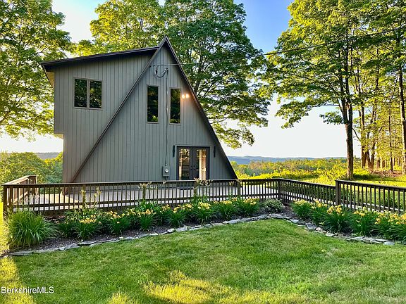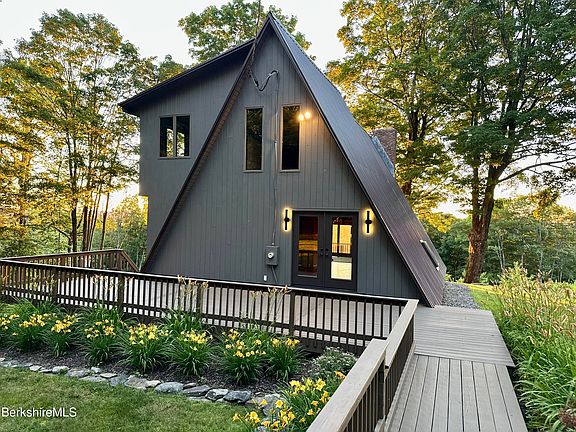 This home is aesthetically pleasing in all ways. Breathtaking views with a truly unique design, make this expansive A Frame stand out from the others. Whether you are sitting in the vaulted ceiling living room by the fireplace, on the deck, or in the primary bedroom, you can relax & soak in the views. Since this property is move-in ready with a new septic system, boiler, metal roof & exterior, there is only one thing left to do... Enjoy the home! Entertaining family and friends with double ovens & an open kitchen & dining room. With a finished walk out basement billiard room, the family fun is endless. Plenty of storage space throughout, along with outdoor space which is a blank canvas ready for your ideas. Conveniently located on a paved rd. 22 miles to Tanglewood, Lenox and Pittsfield. 24 minutes to Jacob's Pillow and 30 miles to Springfield. This stylish, sturdy home will embrace your weekend getaways, primary residence or Airbnb whichever you choose.