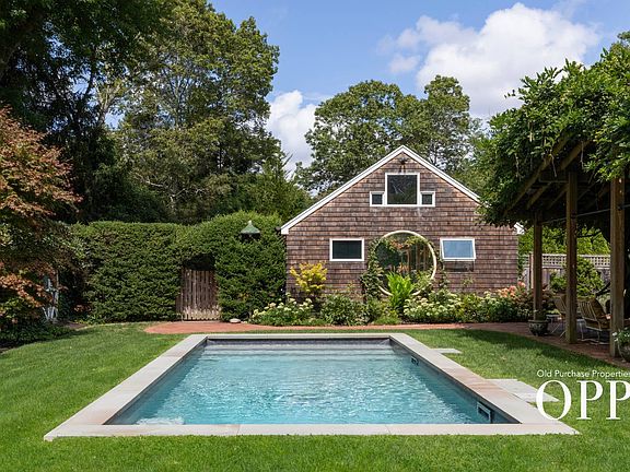 This cedar-shingled home offers three bedrooms, two and a half baths, and a layout designed for both everyday living and entertaining. The first floor includes a private primary suite with a full bath and access to a deck with its own outdoor shower. The living room, with soaring ceilings, exposed beams, and walls of windows, captures light throughout the day. Sliding glass doors lead directly outside, extending the space into the backyard for effortless entertaining. A spacious dining area, kitchen, and powder room complete the main level. Upstairs, two additional bedrooms and a full bath add flexibility. Outdoors, landscaped grounds create a private setting with a pergola for shaded dining, a sparkling in-ground pool, and a substantial outbuilding with endless possibilities. The property is ideally located close to downtown Bellport, offering easy access to the ferry to Ho-Hum Beach, country club for golf and tennis, shops, galleries, and dining.