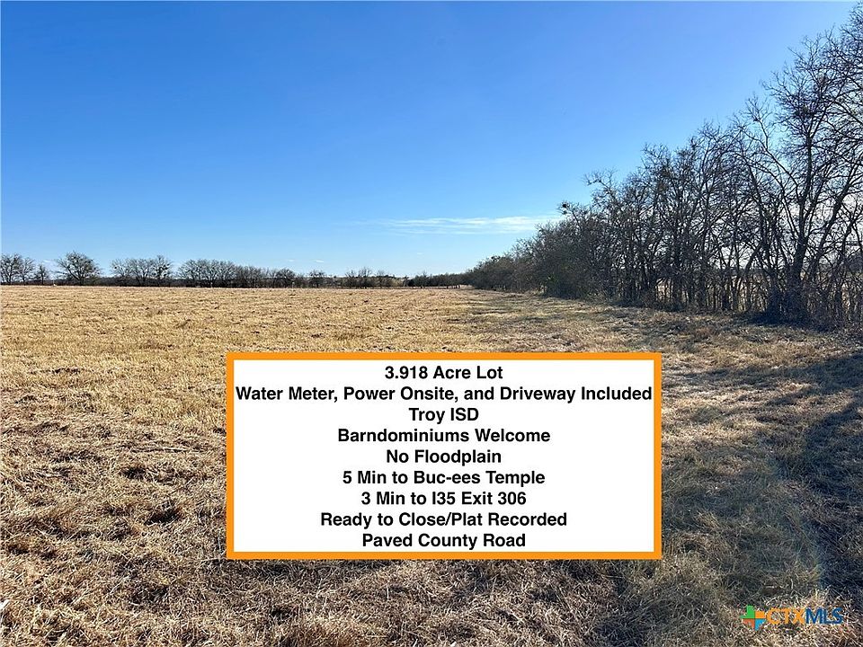 3.91 acre lot acre lot now available, no FEMA floodplain. Barndomiums welcome. Highly acclaimed Troy ISD and located just 3 minutes from I35, and 5 minutes from Buc-ee’s Temple. Paved county road frontage, and paved all the way to I35 exit 306. Water Meter is Paid For Already and is being installed soon, new overhead power to the lot, as well as a 20'x40' permitted gravel driveway entrance off of Bottoms East Rd. Just a few minutes from I 35 and Temple! Look for white PVC Stakes at all property corners and PVC Stakes at the Mid-Way point on each lot to help identify boundaries. Exit 306 off I35, turn right on Bottoms East Road, 2.5 miles on Bottoms East Rd, the lot is located off Bottoms East Rd.