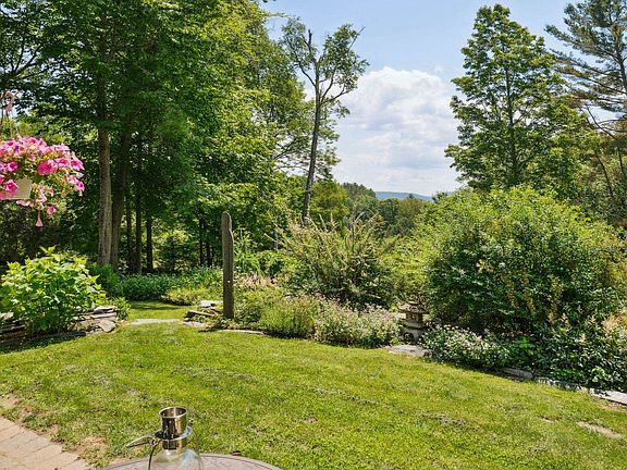 From the moment you turn onto the private road, you are greeted by a shimmering pond and mature trees as you make your way up the circular driveway. Beautiful gardens and landscaping encompass the house and there are long range views from the covered patio out over the vine laden pergola. On the backside of the house is a large brick patio and a small, covered porch surrounded by more gardens and stone walls. Inside, this well-designed home has a great flow with high ceilings and wood beams from a Tunbridge covered bridge. The oversized mudroom leads to the eat-in kitchen which has a 1/2 bath and connects separately to both the dining room and the living room which has a gas fireplace and French doors out to patio and gardens. Beyond this center area is the primary bedroom suite with a walk-in shower and Jacuzzi tub as well as two walk-in closets. Down the hall is an office/bedroom, another bedroom, a full bathroom and the laundry. Open stairs lead up to a landing that offers access to an in-law suite on one side and a family room, office, 3/4 bath and a bedroom on the other side. Unique features include leaded windows from Harvard, a stair railing from the Dartmouth library, and distinctive stone work in the entryway. Set on a beautiful lot with access to hiking trails, this home offers room to spread out and spaces to gather. Ideally located just minutes from downtown Randolph, Gifford Hospital, Vermont State University, and I-89, this property is truly a must-see.