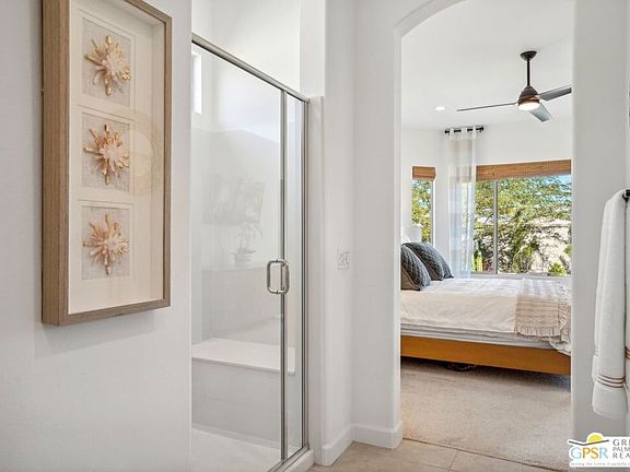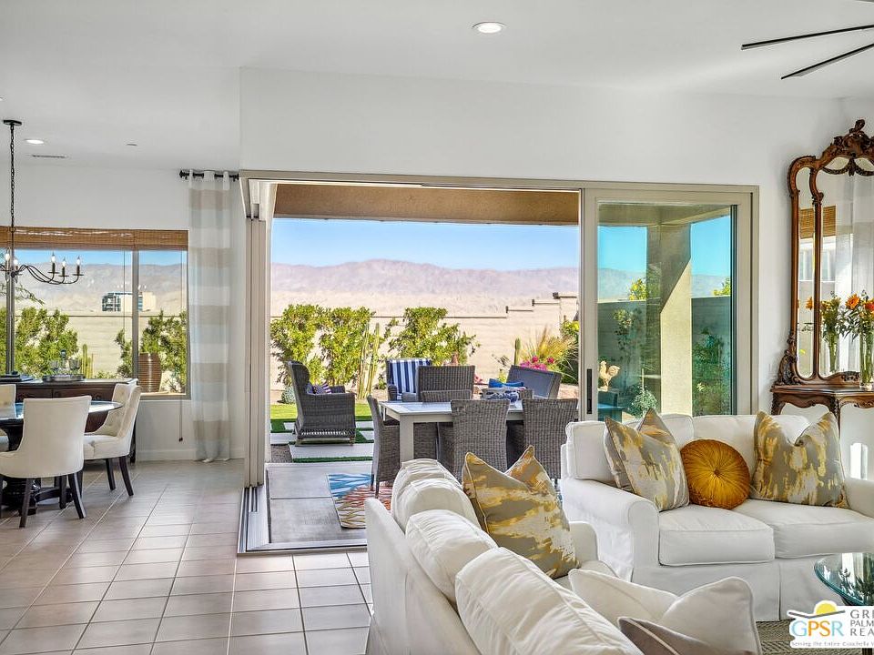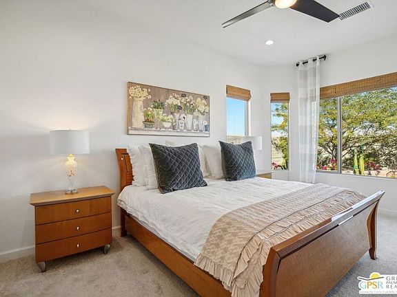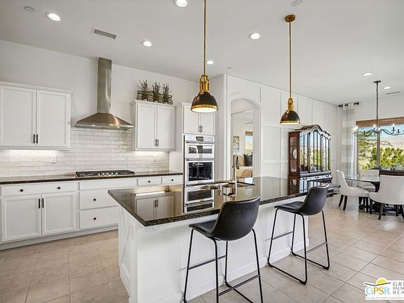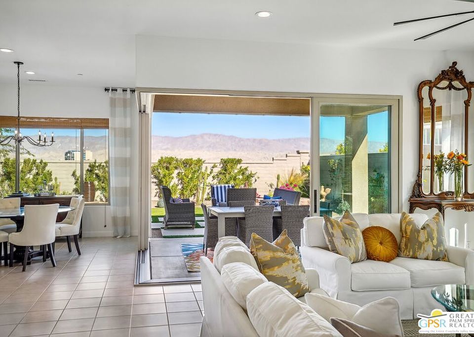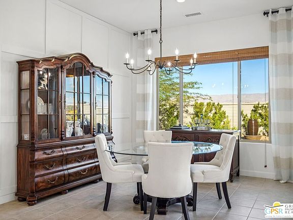 Welcome to the desert's Premiere 55+ community, Del Webb Rancho Mirage! This stunning Plan 4, Sanctuary with Prairie facade offers 2 bedrooms + den/office and 2 and a much sought after half bath with over 50k in UPGRADES and fabulous VIEWS from a fully landscaped yard! This open concept floorplan offers a gathering room with custom paneled walls, custom window treatments and upgraded 90 CORNER SLIDING GLASS DOORS expanding your space to the covered outdoor patio for that quintessential indoor outdoor desert lifestyle. The kitchen boasts quality stainless steel appliances, upgraded 42" upper cabinets, dark hardware, granite countertops, and a large island with artfully selected pendant lights. The primary bedroom with bay window bump adds square footage, and offers mountain views, an ensuite bath, with dual vanities, upgraded dark hardware and fixtures, walk-in closet, and stall shower with bench. The secondary bedroom has an ensuite bath with dark hardware/fixtures and bathtub/shower offering privacy for guests. Leased solar is just $164.03 per month. Enjoy the exceptional lifestyle of Del Webb with seamless access to the clubhouse, offering a state-of-the-art fitness center, pools, spa, tennis courts, pickleball, and more!