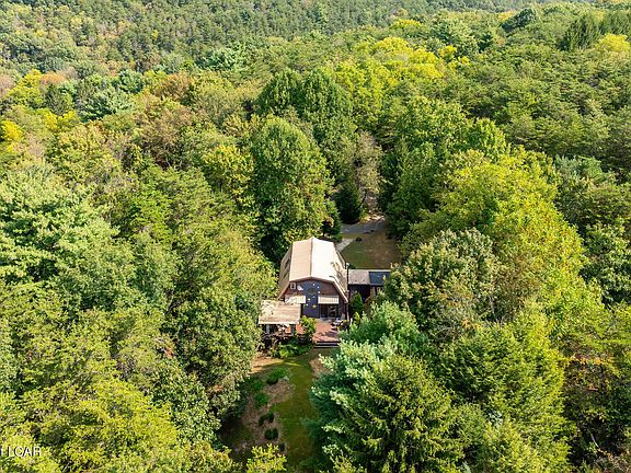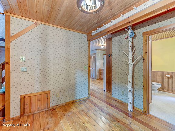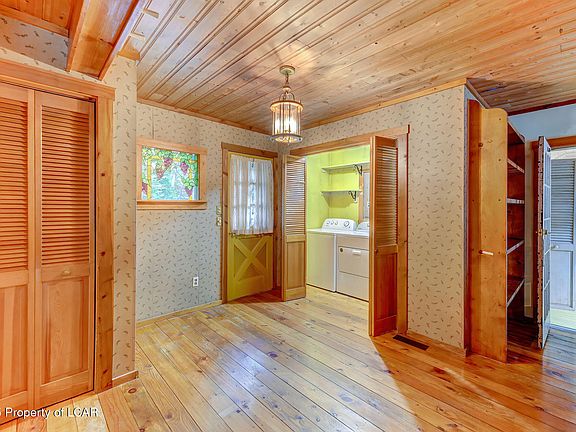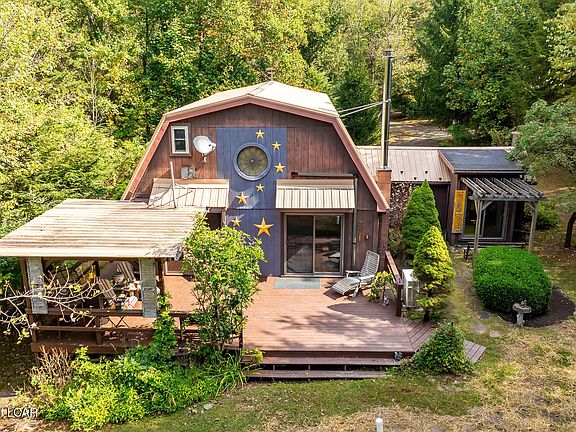 This is truly your cottage in the woods... quaint, private, and surrounded by nature on 3.18 acres. Step inside to find beautiful wood floors and a living room that flows into the dining area and kitchen. A full bath features a handicap-accessible tub, and the convenience of first-floor laundry is already in place. Off the living room, a former greenhouse has been converted into a flexible space, perfect as a first-floor bedroom, office, or hobby room. Upstairs, the loft-style primary suite includes two closets and access to a private deck overlooking the treetops. Stained glass windows add unique charm, while a hookup in the living room allows for a cozy wood stove if you choose.