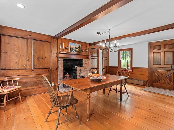 Located on one of Suffield's most desirable streets, just steps from Main Street and the Suffield Country Club, this classic New England Cape blends timeless character with modern comfort. Inside you'll find two fireplaces, including a craftsman-style dining room with wide-plank pine floors and wood paneling, plus a welcoming living room. The sun-filled family room addition with walls of windows and built-in bench seating is the perfect all-season retreat overlooking the private backyard. The home offers four bedrooms (including a convenient first-floor primary) and two full baths with vintage charm. The kitchen is bright and efficient, featuring newer appliances and easy flow into the living spaces. Recent upgrades - including a new roof, windows, and siding, provide peace of mind and low-maintenance living. Outdoors, enjoy an expansive backyard with mature landscaping, patio, and fire pit, ideal for entertaining or relaxing at home. With its unbeatable location and classic curb appeal, this home offers a rare opportunity to enjoy both small-town charm and everyday convenience in the heart of Suffield.