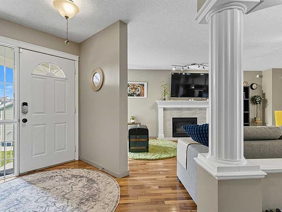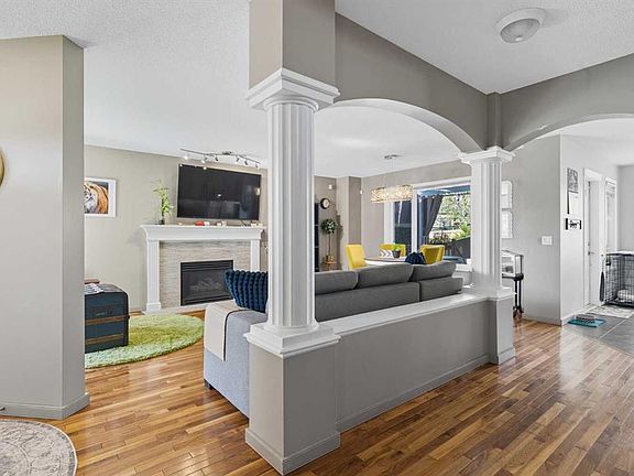 This beautifully maintained home in the desirable community of Tuscany offers a bright and open main floor that seamlessly blends the living, dining, and kitchen areas into a covered outdoor pergola space, perfect for entertaining or everyday living. Rich hardwood floors flow through the main living areas and are complemented by high-end trim, crown moulding, and stately columns, while an elevated stone tile gas fireplace adds warmth and character. The elegant white kitchen features a built-in wine and coffee bar, breakfast bar, corner pantry, a full appliance package including a new dishwasher, and stunning tile finishes with mosaic backsplash and oversized modern floor tiles, all enhanced by large windows that flood the space with natural light. Upstairs, the spacious primary suite offers a huge walk-in closet and a sleek ensuite finished with dark tile, glass shower enclosure with a rainfall showerhead, double sinks, ample cabinetry, and a built-in medicine shelf. Two additional bedrooms are generously sized, making them ideal for children, guests, or home office setups. The main floor also includes convenient laundry with a new washer and dryer. The fully developed basement expands your living space with another full living room, bedroom, a full bathroom, and multiple storage areas. Outside, the backyard is a true highlight—featuring an expansive deck with a BBQ gas line, established flower beds, and a covered pergola perfectly suited for outdoor dining or creating your own private oasis. A double attached garage adds plenty of storage and parking. Located just a few steps away from Tuscarora Place playground, scenic walking trails, and a dog park, and with quick access to schools, shopping, and major commuter routes, this home offers the perfect blend of comfort, elegance, and convenience.