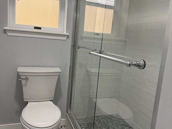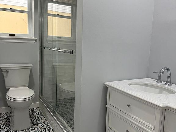1 modern bathroom with standing shower & glass sliding door