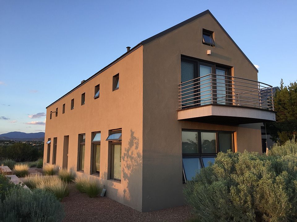 Horses Welcome! Wide Open Spaces with Mountain Views are seen from this contemporary home designed by award-winning architect, Robert Zachary. Glass, concrete and steel form the 3 bedroom, 2 1/2 bath home. Diamond plaster walls add to the warmth of the living space. There is a feeling of peace and calm in the house and on the land. The living room is 2 stories high bringing the land and skies into the home. The kitchen is designed for a chef and opens to the light-filled dining area. A separate formal dining room is located off the living room steps from the central kitchen, the heart of the home. The entire second level is the Master suite with Master bedroom, Master bath and office. Two guest bedrooms, additional full bath and half bath are on the main level. A large recreation room suited to many uses. A detached 2 car garage with a large view deck and a walled yard are delightful year round. There are hiking trails steps from the front door and horses are allowed. The beautiful, mature landscape completes this sanctuary in the country that is only 20 minutes from downtown Santa Fe. Amenities include: Property abuts the Galisteo Basin Preserve for hiking and biking & Horseback riding, wine room, exercise room with view, dedicated laundry room also with a view, big attic for storage, bedrooms with lofts, large family room or studio with surround sound, beautiful, mature landscape, roof-top deck to enjoy spectacular Galisteo/Eldorado skies and 360 degree Mountain views.