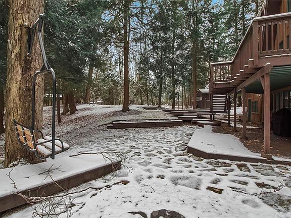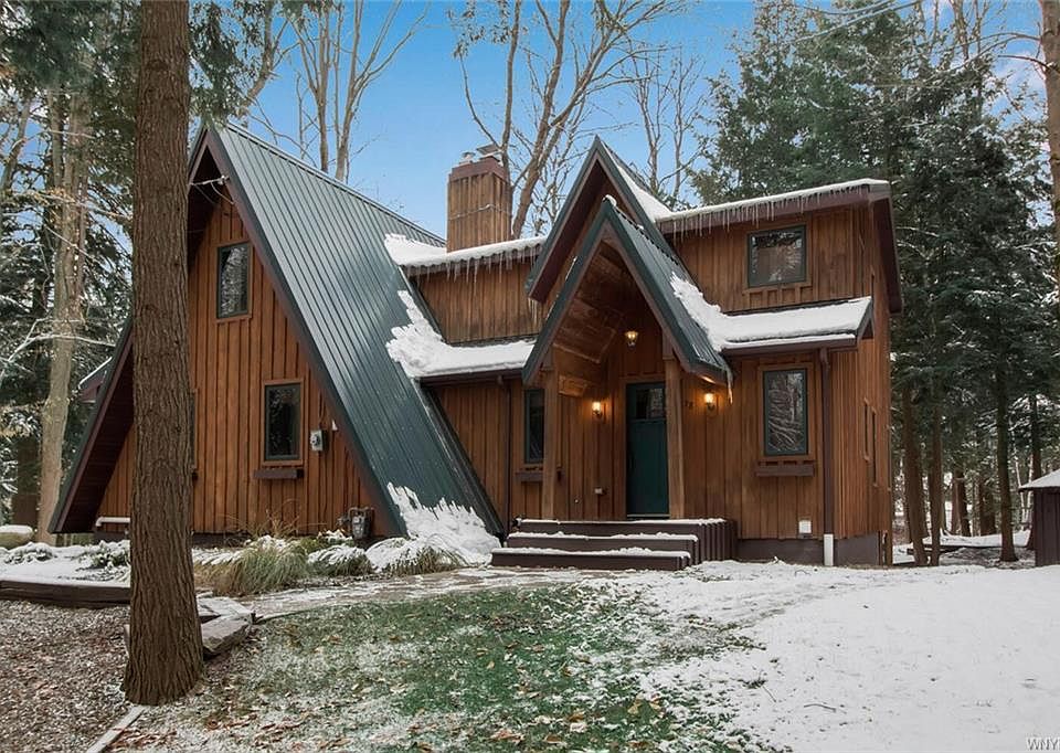 Contemporary A-Frame sits off the road & nuzzled in the woods of a Craneridge/Kissing Bridge setting. Deceiving in size w/multi-floors of living space. 1st floor enjoys the living room, into a family room w/ woodburning stove joined w/ dining & open kitchen. Kitchen previously updated w/ stainless steel appliances, recycled glass countertops. Exit sliders to deck overlooking the wooded backyard transformed to a cool outdoor space. Custom Oak Staircase by Quaker Mill to Private Primary Bedroom w/Bath & 24' Closet. Spiral Staircase off kitchen both up to a hideaway bedroom & down to more at ground level bar/entertaining, 23 x 11 bonus rec room, remodeled full bath/shower '18, additional bedroom/office with sliders & exit doors to backyard. Utility Room boasts 100 AMP service, new ductwork '18, Furnace '16, On Demand Water '17, Radon Mit In Place, Built in Safe, All New Pex Plumbing. More Updates: Dishwasher '17, Backyard Re-Graded - Seeded, Built Stone Retaining Wall Around Property, Re-Purposed Railroad Ties, Removed the Pond, Fire Pit - Very Manageable Backyard Paradise. Listed SF is from Seller's Appraisal & DOESN'T include the finished space at ground level. May be appx 600+ s/f.