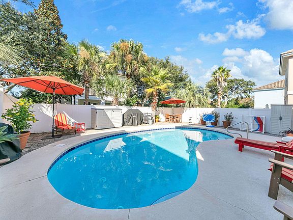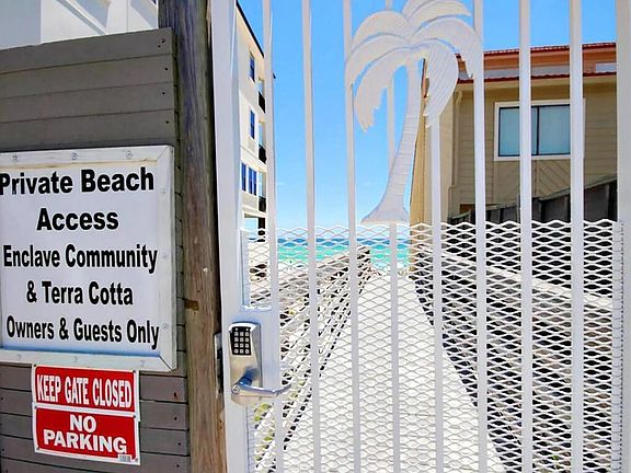A Luxuriously Remodeled Beach Retreat Featuring a Private Heated Saltwater Pool and Exclusive Beach Access awaits! 78 Terra Cotta Way, an exquisitely reimagined 3-bedroom + office/bunk room, 3-bath luxury beach home featuring a private heated saltwater pool and exclusive deeded, gated beach access, perfectly situated in the prestigious Terra Cotta Terrace community. This remodeled coastal haven welcomes you with a new roof, tropical landscaping, a brick paver driveway, a charming covered front porch, fresh 2021 exterior paint with completed stucco inspection, and additional outdoor storage added to the exterior of the home. Inside, the open-concept layout is elevated by Calacatta Gold tile flooring, crisp white trim, an elegant real wood-burning fireplace, and designer finishes throughout The totally remodeled chef's kitchen showcases breathtaking Misterio Vico Subra quartz waterfall countertops, Storybook greige lower cabinetry, Charlotte Beach upper cabinetry, champagne hardware, a gas range with double oven, and a stunning glass subway tile backsplash, all hand-crafted to create a luxurious statement for your friends, family and vacationing guests. The spacious bedrooms and spa-like bathrooms offer comfort and serenity, while the flexible office/bunk room provides the perfect space for guests/bunk room or remote work. The second-floor master suite invites you onto a serene private balcony facing east, where each morning greets you with Destin's breathtaking sunrise - an intimate moment that we all need. The first-floor primary suite provides effortless luxury as well, offering elegant French-door access to the sparkling pool. Outside, the pool area features a remarkable motorized shade system that extends from the home to cover the water, creating a blissfully cool retreat during the warm summer months.