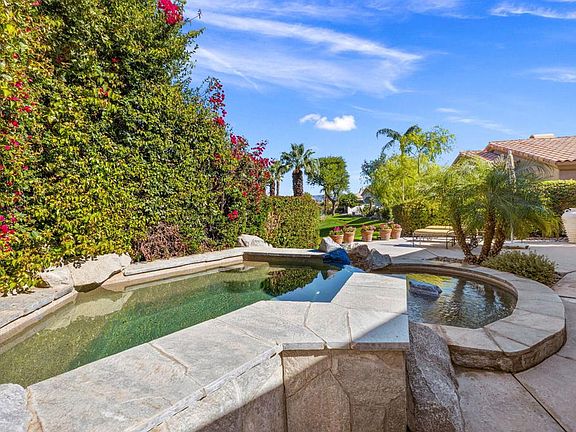 Discover your dream home in Indian Ridge, Palm Desert! This rare Bougainvillea 2 with custom casita sits on a spacious .04-acre corner lot at Dove Run and Tomahawk--a size seldom found in the community. The main house features a well-designed Bougainvillea 2 floor plan with 3 bedrooms, 3.5 bathrooms, and builder upgrades including granite countertops, travertine flooring, surround sound speakers and plantation shutters throughout. You'll find cozy fireplaces in both the great room and primary suite, creating a warm ambiance. Additionally, the property includes a custom-built casita with a comfortable living room, two bedrooms, and a full bathroom--perfect for guests or extended family. Step outside to an expansive outdoor living area featuring a spool, built-in BBQ and a private patio with views of the stunning Chocolate Mountains and a park-like setting overlooking the 18th hole of the Arroyo Course. The drought-tolerant landscaping with turf and rock ensures a low-maintenance, beautiful yard. Just a short distance to the south driving range and community pool, this home offers exceptional space for family living and entertaining. Plus, it's furnished per inventory, and there's no wait for Club membership--your ideal lifestyle awaits!
