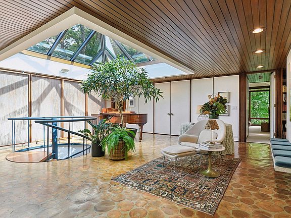 Fabulous Mid-Century Modern Home on Long Lake. Designed by renowned architect Ralph Raspson and thoughtfully remodeled by James Dayton, this stunning modern home, named "Longshadows," for its long shadows from the mature trees, is nestled on 8 private wooded acres with 200 feet of shoreline on Long Lake. The central room features end-cut oak floors made from trees felled on-site and a large skylight designed to capture views of the treetops. The open floor plan with floor-to-ceiling windows offers panoramic views of the serene, wooded landscape. Four spacious bedrooms, each with ensuite bathrooms. The main floor primary suite with a lakeside sitting room, two walk-in closets, and a luxurious bathroom featuring heated floors, a soaking tub and a huge shower. The gourmet kitchen features terrazzo countertops, a large side-by-side Sub-Zero fridge and freezer, a Wolf range, and a Bosch dishwasher. Basement has recreational room, exercise room, newly remodeled half bath, huge studio/workshop and abundant storage.