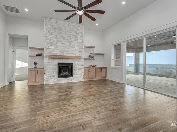 Stately and Elegant! Walking up to the front door you will feel the presence of this home. First step in the door shows off the striking rock fireplace and a wall of windows that invites you to the oversized, very private, covered back patio. This one has it all with a flow of tasteful colors, upgraded lighting & fans, lvp flooring, tile bathrooms, and quartz countertops. Dream kitchen is complete with a gas cooktop, double ovens, & a oversized pantry with wrap-around appliance shelf. Primary bedroom boasts a spa like bathroom and huge walk in closet. Laundry room complete with sink, folding table, clothes rod, & bench/coat rack. 16' x 40' RV GARAGE has 14' tall x 12' door. Builder added concrete retaining walls to take away concern of runoff.