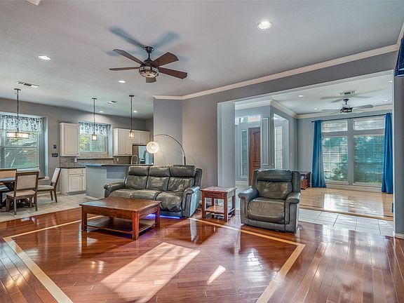 Lovely family home in very desired neighborhood. 4 bedroom and 2 and a half bath custom home with split bedrooms on large fully landscaped corner lot with mature trees and sprinkler system. High ceilings. Primary bedroom has a trayed ceiling and bamboo flooring with many windows looking out over the backyard with open patio. See the picture of the awesome primary bedroom closet. Kitchen is open the family living room with gas log fireplace. Backyard has an eight fence for privacy. Neighborhood includes a fantastic large swimming pool with lots of trees, grill area, clubhouse with kitchen and restrooms, tennis, pickle ball courts, playground and basketball court. Endless hours of fun for the family with dues less than the cost of just maintaining a pool in your back yard.