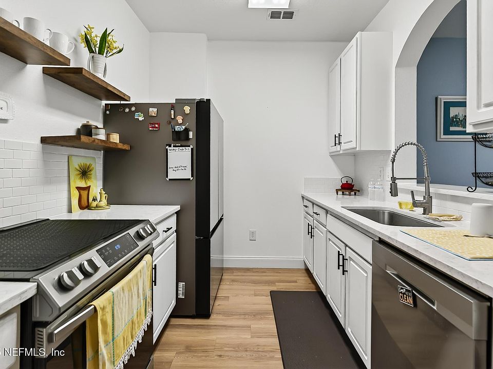 Beautifully Upgraded 3-Bed/2-Bath First-Floor End Unit in Gated Community! This stylish first-floor corner condo offers modern upgrades throughout and a prime location. Featuring laminate wood and tile flooring throughout, the home includes a screened-in patio with screed door to direct access of outdoor space. The kitchen boasts 42'' white cabinetry, solid quartz countertops, a subway tile backsplash, and newer (2022) stainless steel appliances. Both bathrooms have been tastefully remodeled with quartz countertops, gray vanities, under-mount sinks, and a brand-new tub in one bath. The HVAC system was replaced in 2024 for peace of mind. Enjoy the security and amenities of a gated community, complete with an elevator in the building and a dedicated covered parking spot. Monthly HOA fees include water, sewer, garbage, and pest control. Conveniently located near I-295, JTB, Mayport, and just a short walk to IKEA. Only minutes to St. Johns Town Center, schools, and restaurants.