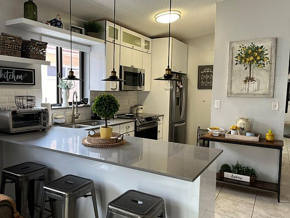Step inside to discover a spacious open-concept layout with elegant tile flooring throughout. The heart of the home is the beautifully updated kitchen, seamlessly connected to the family room, creating the perfect setting for both daily living and entertaining. The kitchen is equipped with stainless steel appliances, ample cabinetry, and direct access to the back terrace, making indoor-to-outdoor gatherings effortless.