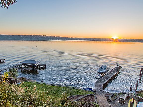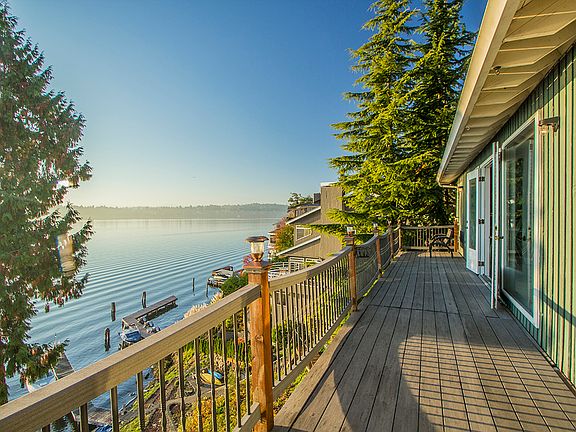 Amazing opportunity to own 85 feet of waterfront on Sun Bay. Wonderful home features main floor dining & living rooms opening to the kitchen and great room. French doors welcome you on the deck to take in the panoramic views of the lake and mountains. Escape to the upper level master and enjoy peace on your private deck. Stroll down the stairs to your terraced retreat from the world. What waterfront home wouldn't be complete without a dock, boat lift and waterslide!
