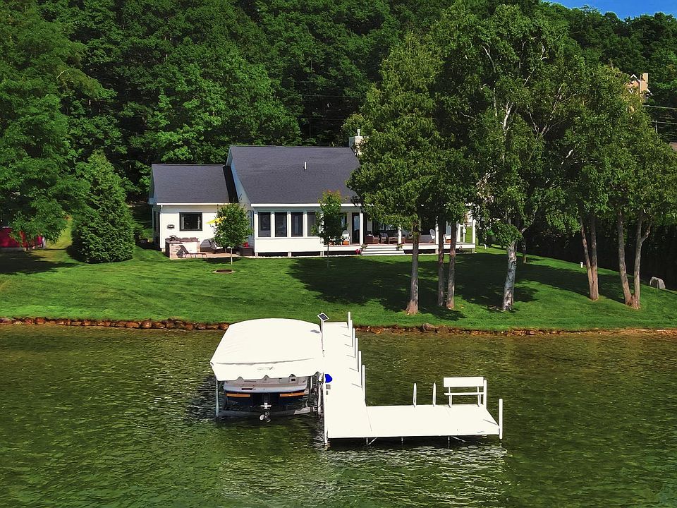 Immaculate in every way, this 2016-built lakefront home offers unmatched attention to detail in a peaceful, private setting with westerly sunset views over South Lake Leelanau. Set on 110 ft of pristine shoreline, the property is professionally landscaped with irrigation and drip systems complemented by a large covered porch with mahogany decking and a screened-in porch for all-season enjoyment. A custom Napoleon outdoor kitchen with granite countertops, stone veneer, grill, side burner, and refrigerator makes outdoor gatherings effortless while a Brock dock system with a solar-powered 4,500 lb shore station (2021) completes the lakeside amenities. Inside, the open-concept design with 9 ft ceilings creates a natural flow for hosting. The chef’s kitchen is the centerpiece, featuring a 9 ft quartz island, stainless steel appliances, double ovens, custom Nowak cabinetry, and a large walk-in pantry—perfect for dinner parties, group cooking, or casual entertaining. The great room, anchored by a natural stone fireplace, offers inviting warmth and seamless connection to the kitchen and dining areas, while the screened porch expands living space into the outdoors. The primary suite includes a walk-in closet and spa-inspired bath with dual sinks and a large walk-in shower, while two additional guest rooms are enhanced with natural lamb’s wool carpet and custom window treatments. A non-conforming bunkroom designed to sleep four adds a fun element for guests or children, and a dedicated office and well-equipped laundry room provide everyday functionality. Mechanical highlights include a fully conditioned and encapsulated four-foot crawl space, dual water softeners, a 50 gal water heater, and closed-cell foam insulation. The insulated and heated garage, EPS whole-home security system, and additional detached storage shed further elevate convenience. Located on a quiet private drive minutes from TC & the surrounding recreation, amenities, and small towns of Leelanau.