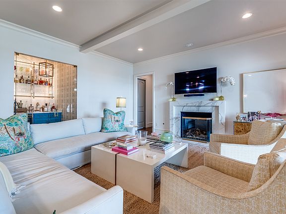 A two-story entry welcomes you inside, filled with soft natural light and anchored by a beautiful staircase which provides a striking architectural moment that sets the tone for the rest of the home. This impressive foyer flows seamlessly into the main living spaces, where tall ceilings, large windows, and designer-selected finishes establish an atmosphere of effortless sophistication. Throughout, custom lighting and window coverings, elevated hardware, and a curated palette reflect the decorator’s attention to detail and commitment to timeless design.