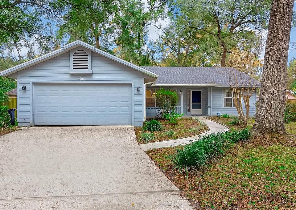 Welcome to Woodlands, a quaint and established subdivision conveniently located off of Tower Rd in SW Gainesville. A job relocation is the only reason this home is on the market, otherwise the seller would still be enjoying all the home has to offer. With mature oak trees, different styles of houses, friendly neighbors, and a cul-de-sac, this location is peaceful and optimal. This 3 bedroom, 2 bathroom home has a split plan with an open layout for the kitchen, dining, and living area. Vaulted ceilings, views of the backyard, and a wood burning fireplace create a welcoming and attractive living space with an ideal flow for entertaining. The kitchen is well laid out with plenty of cabinets, a pantry, windows overlooking the front yard, and additional room for a breakfast table or additional storage options. The main living space opens to a screened in porch with with a tile floor and a small deck area with stairs going to the backyard. The current owner is a gardener and the backyard has wonderful light for growing, planter boxes, and an orange tree full of fruit! The main bedroom has a vaulted ceiling, newer carpet and the en suite bathroom has a walk in closet, dual sinks, a large soaker tub, and a separate shower. On the other side of the home there are two guest bedrooms and a guest bathroom. All of the bedrooms in the house have carpet that is only a few years old, and the main living spaces and kitchen have solid wood floors. This home received a new roof in 2023. Make an appointment to see this home, you'll be glad you did!