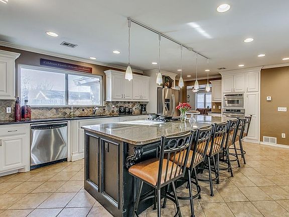 DREAM KITCHEN!!! You'd find this kitchen in a million dollar property!! Huge 5'x10' island with beautiful granite slab. Fireplace in kitchen too!!! Gas cooktop, custom cabinets, stainless GE Profile Appliances, tumbled marble backsplash...gorgeous!!! Two bedrooms and two bathrooms downstairs, plus office. Wood floors in living and dining. Master suite is an amazing 720' retreat! Master bath, walk in closet and additional closet and massive bedroom space make up this breathtaking space. Separate zoned heat and air too. Wooded backyard with extensive deck and gazebo and lush landscaping. Underground storm shelter....maybe the biggest you've ever seen. Room for the neighbors. This house is so special. Must see!