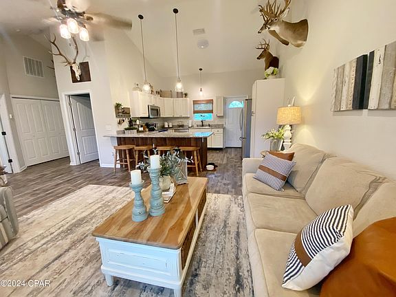 Inside, the home boasts a spacious 2 bedroom, 1 bath layout, accentuated by vaulted ceilings that elevate the sense of space and airiness. The open floorplan seamlessly connects the living, kitchen, and bedroom areas, fostering effortless flow and connectivity throughout.