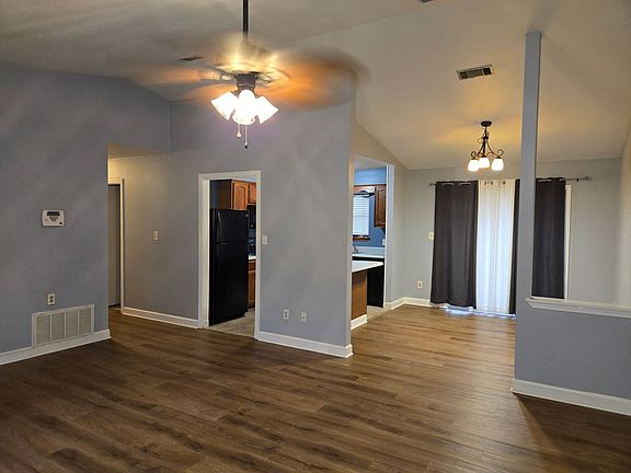 Breakfast barCeiling fanFoyer with coat closetFenced backyardFully equipped kitchenCathedral ceilingFormal dining room