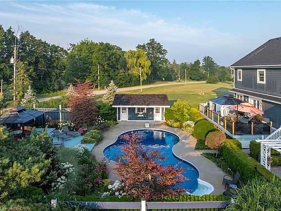 PRIVATE ENTERTAINERS PARADISE … Stunning, CUSTOM-BUILT estate nestled on a uniquely configured property at 7804 Schisler Road, offering OVER 2.5 acres of gorgeous, landscaped grounds. Sitting at the border of Niagara Falls & Welland, there is added convenience of access to amenities in both cities, plus easy access to HWY 406/QEW & new hospital! This impressive 3+2 bedRm, 3 bath family retreat offers more than 3,600 sq ft of beautifully curated living space & is truly an entertainer’s paradise. From the moment you step into the GRAND FOYER w/porcelain-tiled flooring, vaulted ceilings & statement chandelier, you'll feel the quality & care that went into every detail. Glass FRENCH DOORS lead into formal dinRm, while the main floor office w/dual closets adds flexibility of use. Hand scraped hickory hdwd flooring flows throughout, leading to an OPEN CONCEPT kitchen featuring QUARTZ counters, under-cabinet lighting, S/S appliances, gas stove & B/I micro, while a bright livRm w/gas fireplace anchors the room. WALK OUT to OASIS backyard boasting an oversized deck w/BUILT-IN HOT TUB, luxury INGROUND POOL (liner 2024), 2 gazebos & multiple sitting areas, POOL HOUSE w/changeroom & manicured, picture-perfect gardens. SUNKEN FAMILY ROOM w/vaulted ceilings & French patio doors to an arboured patio, 3-pc bath & laundry complete main living area. Upper level features a BONUS LOFT area - perfect for gaming or play. SPACIOUS PRIMARY SUITE offers a custom WALK-IN closet & LUXURIOUS, SPA-LIKE 5-pc ensuite framed by vaulted ceilings. 2 additional bedRms & 4-pc bath. Lower level includes 2 more bedRms, ideal for extended family. With a TRIPLE car garage (separate heat + inside entry), DUAL driveways w/parking for 20+, multiple septic tanks, drilled well for irrigation & 2000-gallon cistern, this property is as practical as it is beautiful. Don’t miss this opportunity to own a multi-functional estate in one of Niagara’s most desirable locations. CLICK ON MULTIMEDIA for video tour & more.