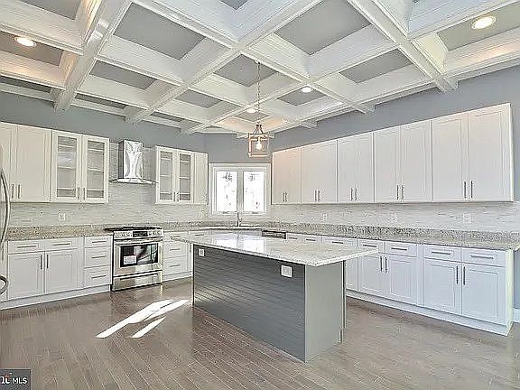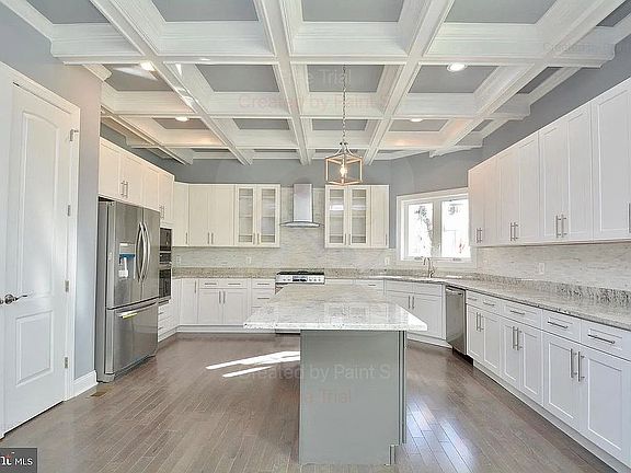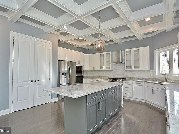 Step inside to be greeted by a grand open-concept living space filled with natural light. The gourmet kitchen is a chef’s dream, featuring an oversized island, custom cabinetry, granite countertops, stainless steel appliances, and a coffered ceiling that adds a touch of elegance.