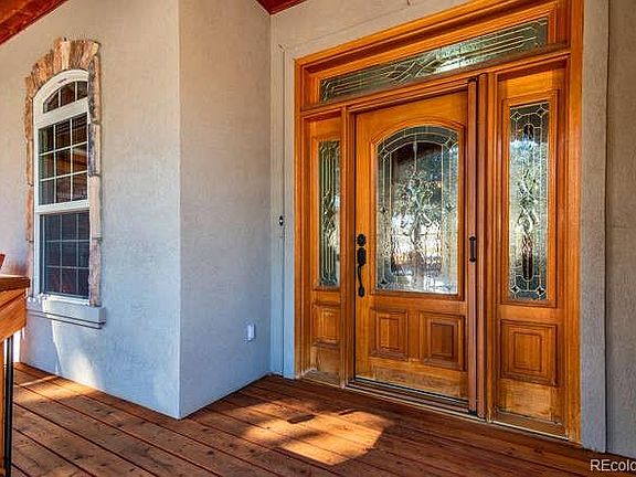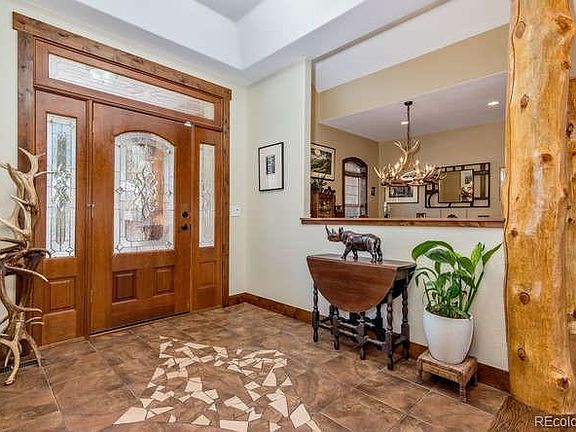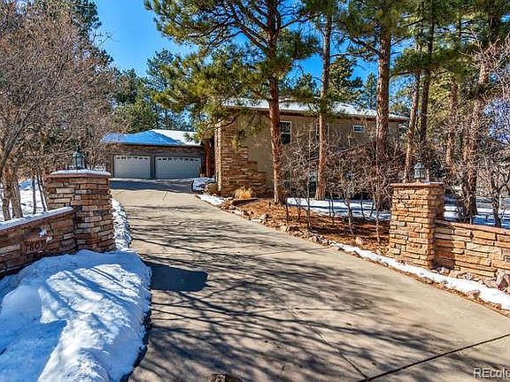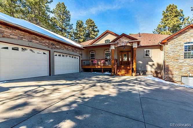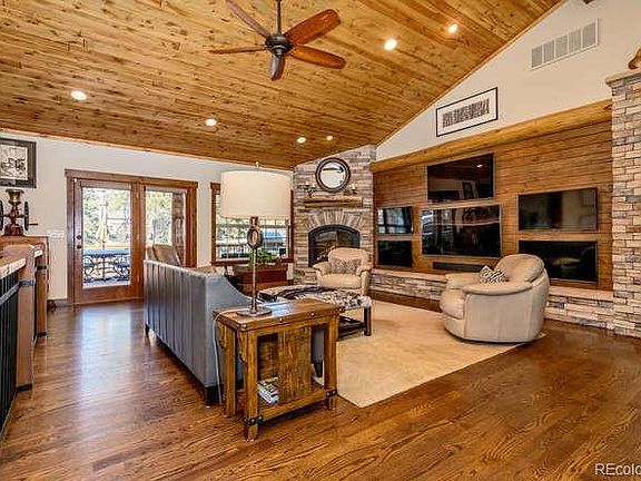 Impeccable custom ranch nestled among the trees, with a mountain feel! Exposed beams, with extensive wood & stone throughout giving a true Colorado ambiance. Wood flooring throughout great room, dining, kitchen & eating space, master bedroom and office/bedroom. Kitchen features hickory cabinetry, granite counters and all stainless steel appliances(double ovens & gas cook-top) & walk-in pantry. With the open floor plan, it is perfect for entertaining. Great flow! Solid alder doors and trim. Massive master bedroom has an exterior door, custom fireplace and spa-like bath with dual walk-in closets and jetted tub. Three secondary rooms on main, and one in basement. Wet bar includes refrigerator, and room for pool table. Flex room for gym or storage with crawlspace. Exterior door in walk-out basement, perfect for in-home business. Finished oversized garage w/ext door and RV parking. Deck has been extended for more outdoor entertainment for gatherings. Gas line for BBQing.