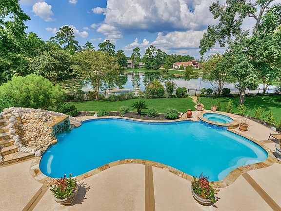 EXPERIENCE WATERFRONT LUXURY in this custom home situated on *rare* .78 ac. lot overlooking lake w/fountain, circle drive, sparkling backyard oasis w/pool & spa, '21 roof, '20 & '24 HVAC systems, tankless H20 heater, '23 resurfaced pool + Kool deck, generator, more! Stunning entry w/forged iron dbl entry doors, dome ceiling & pop-up ceilings accented w/stained wood, encased openings & moldings, versatile dining/parlor rm w/wine grotto, great rm w/beamed cathedral ceiling, Juliet balcony & dbl-sided fireplace to covered patio! Chef's kitchen features built-in fridge, dbl ovens, 48" cooktop, walk-in pantry, bar seating, butlers pantry! Plush owner's retreat w/dual-sided fireplace to spa bath w/jetted tub, walk-in shwr, dual vanities, enviable storage! Handsome study, secluded guest suite & 3 spacious secondary BRs upstairs w/wet bar & balcony in game rm, media rm! Don't miss walk-in attic & oversized 3-car gar! Zoned to top-ranked schools, nearby amenities in The Wdlds & EZ access to 45!