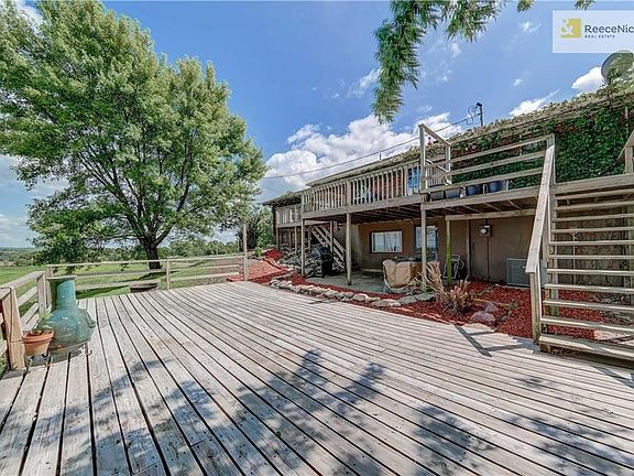 TRUE RANCH HOME WITH FINISHED WALKOUT BASEMENT! This place has it all! Spectacular views of countryside from the 2nd level deck! Newer roof & gutters! 2 Wood burning fireplaces! Appliances Staying-including refrigerator, washer, dryer, dishwasher, stove & micro! Spacious living room w/built-in book shelves & bricked fireplace, 2nd fireplace is on lower lever. Land improvements-drainage tile & terraced! 27 acres income producing! Blacktop & chip/seal frontage, no easements! Pole barn, fruit trees, pond & creek!