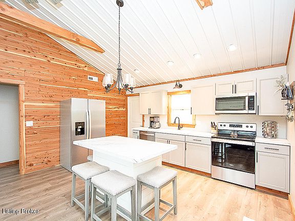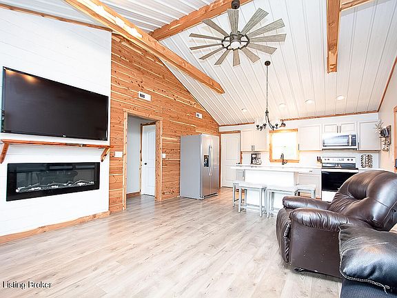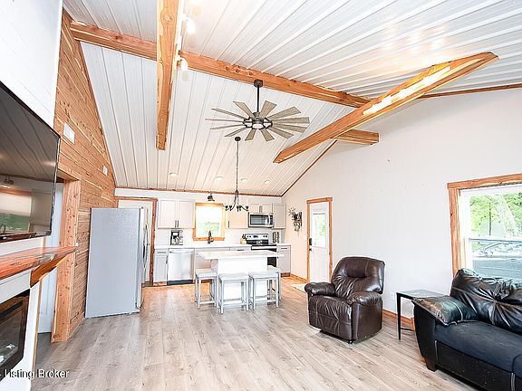 Open & completely renovated in Bullitt County - this charming ranch home has been lovingly updated in the perfect modern farmhouse finishes. LVP flooring greets you in the living room and flows from there throughout the home. The perfect mix of country and modern are found from the start in the vaulted open living area with its updated LVP flooring, warm wood accent wall, metal roofing with exposed beams and a shiplap wrapped inset gas fireplace to cozy up the living room. The beautifully updated eat-in kitchen features classic white shaker-style cabinetry, stainless appliances and a center island with breakfast bar. Just off the kitchen, a mud-room style side entry houses the laundry room. LVP floors continue into the two bedrooms, both with knotty pine plank pine plank ceiling. The updated full bath features large scale tile flooring and shower surround, with a transom window allowing natural light into the space. A fully fenced portion of the yard is ideal for pets on this 1.25-acre lot with storage shed for your all of your outdoor needs. This property is located in a floodplain. The current insurance premium is $451 annually.