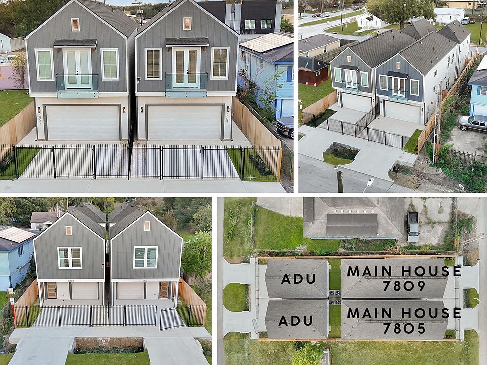 Welcome to this versatile multi-family property featuring a main home and an accessory/additional Dwelling Unit (ADU) on the same lot with separate entrances. The main residence faces east (front door faces north) and includes a 2-car garage. Interior features a natural palette with elegant gold accents and a modern frameless glass railing. The ADU is located back-to-back with the main home, facing west, and includes a 1-car garage. Entry opens to a mud area with stairs leading to a 564 sq. ft. apartment featuring a full-size kitchen with a solid wood butcher block countertops, window coverings, and Two Gated entries. Ideal for multi-generational living or investment, this property offers flexibility, privacy, and modern design throughout.